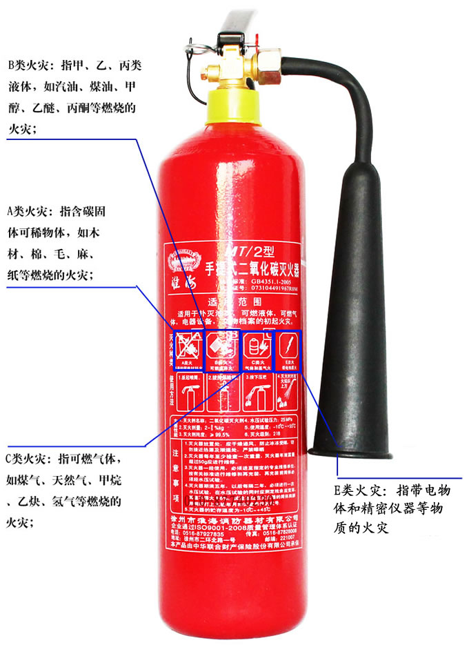 5.使用二氧化碳灭火器灭火时,手提灭火器在喷射过程中应始终保持直立状态,切不可水平、横卧、颠倒;当不戴防护手套操作时,切记不要用手接触喷嘴或金属管,以防冻伤;在室外使用时操作者应站在上风方向;在室外大风条件下使用时,因喷射的二氧化碳被风吹散,灭火效果很差;在狭小的室内使用时,灭火后操作者应迅速撤离,以防二氧化碳中毒;二氧化碳扑救室内火灾后,应先通风然后囘进入,未通风不得进入室内,以防中毒窒息。MT/2、MT/3、MT/5、MT/24co2二氧化碳灭火器价格